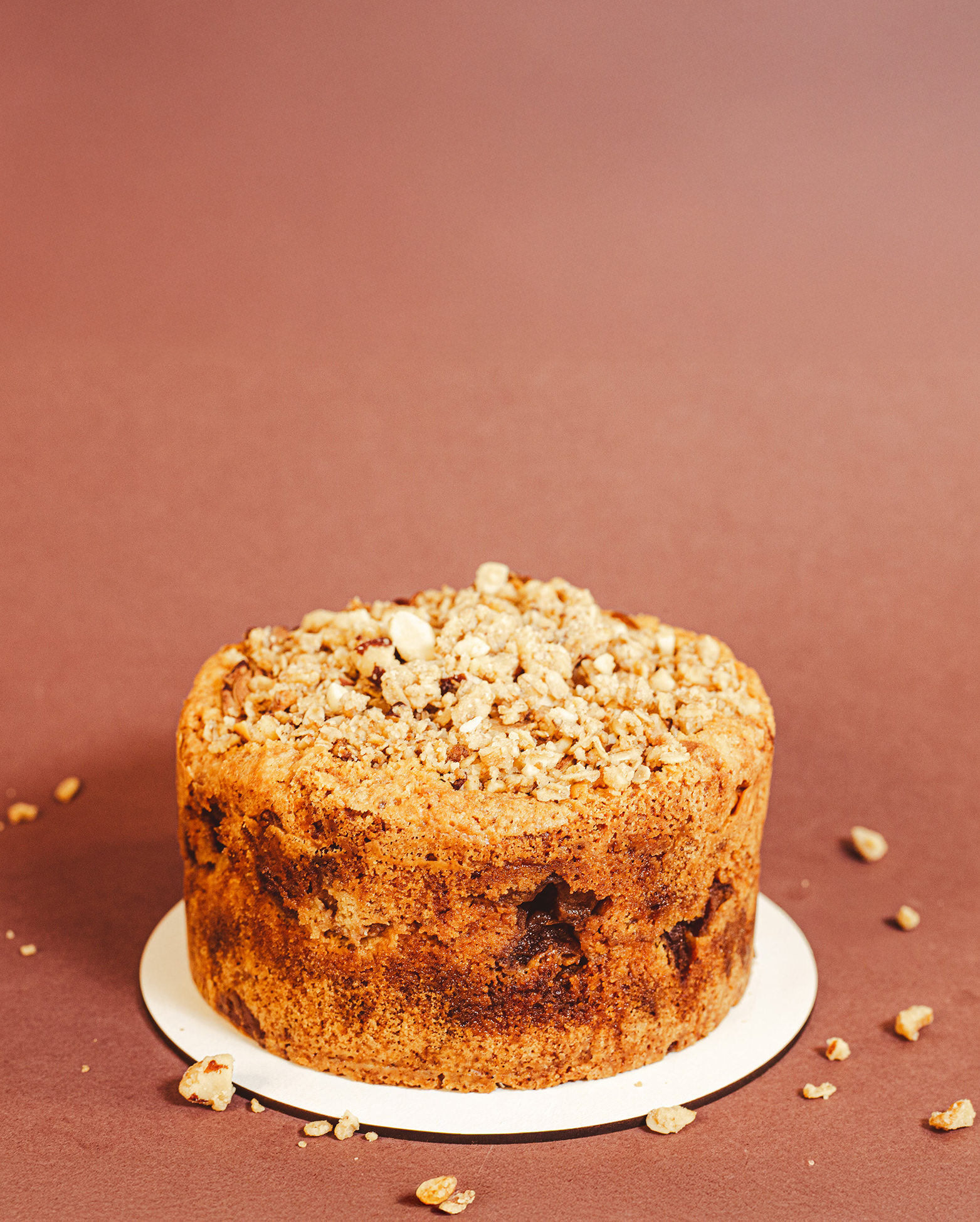 Coberto por crumble de nuts: uma “farofinha” especial de castanha do Brasil e nozes.