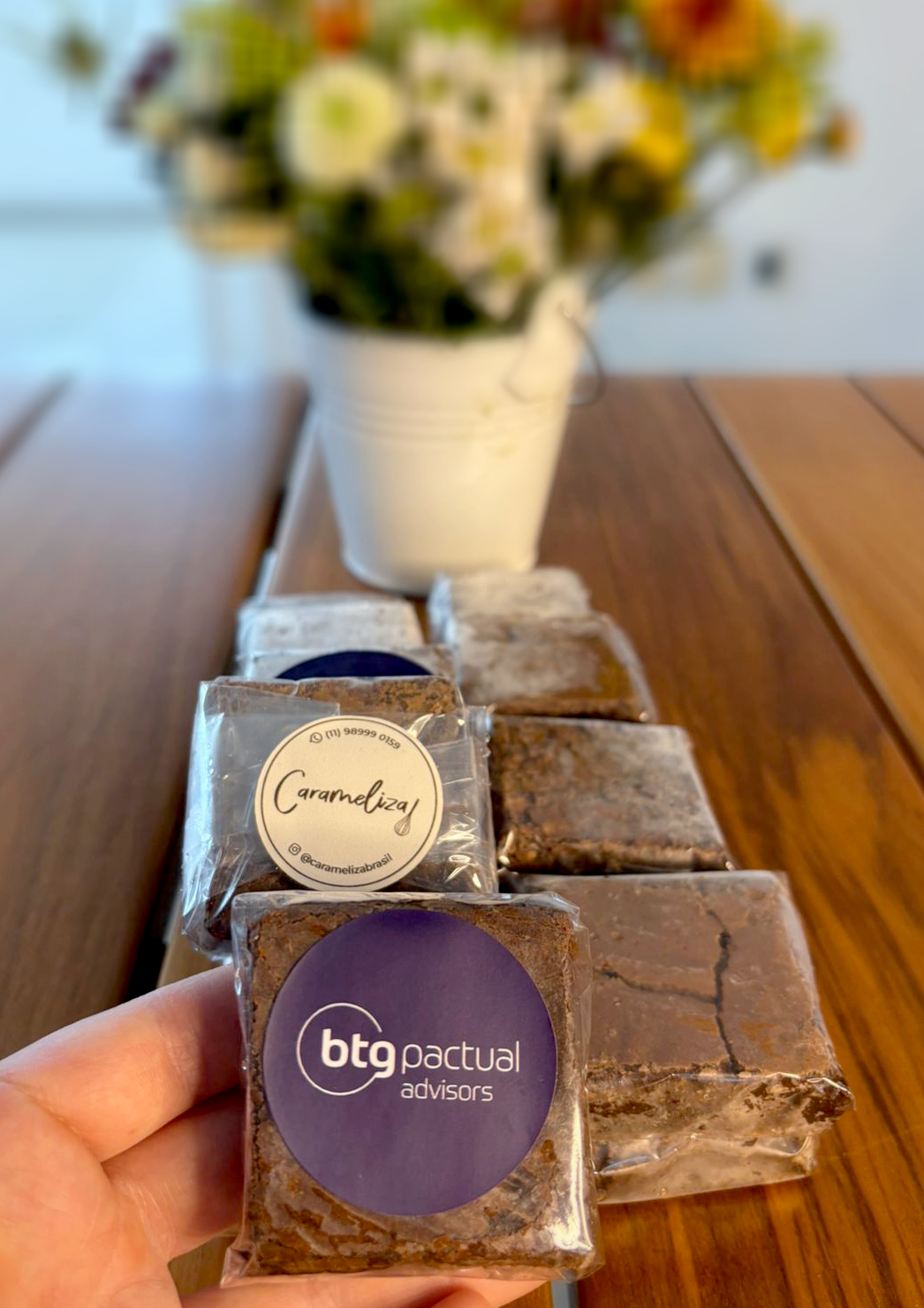 A embalagem pode conter casquinhas de brownie de chocolate, de chocolate com brigadeiro de caramelo ou de blondie, separados ou misturados! Será sempre uma surpresa maravilhosa!